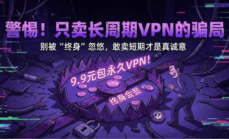 现在的 VPN 市场简直就是个大型“杀猪盘”现场,满大街都是“99元包永久”、“买一年送三年”的诱人广告。但这背后其实违背了基本的商业逻辑:VPN 是持续消耗带宽成本的服务,那些只敢卖长周期套餐的商家,本质上是在玩“庞氏骗局”,收割一波就跑路。
